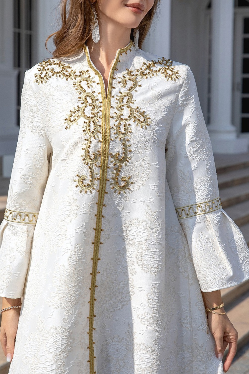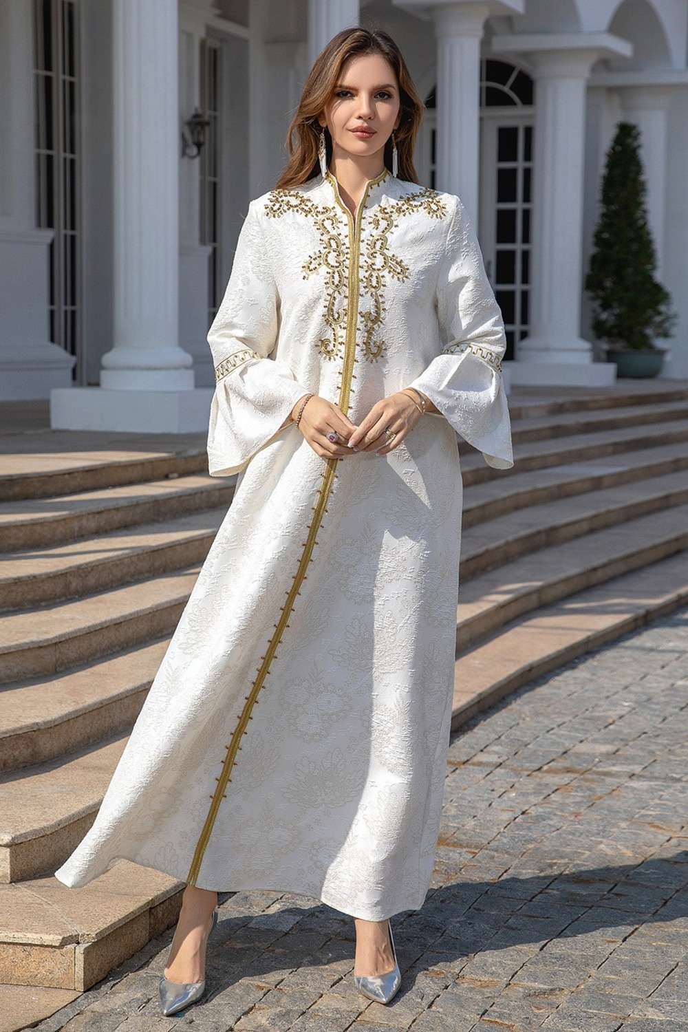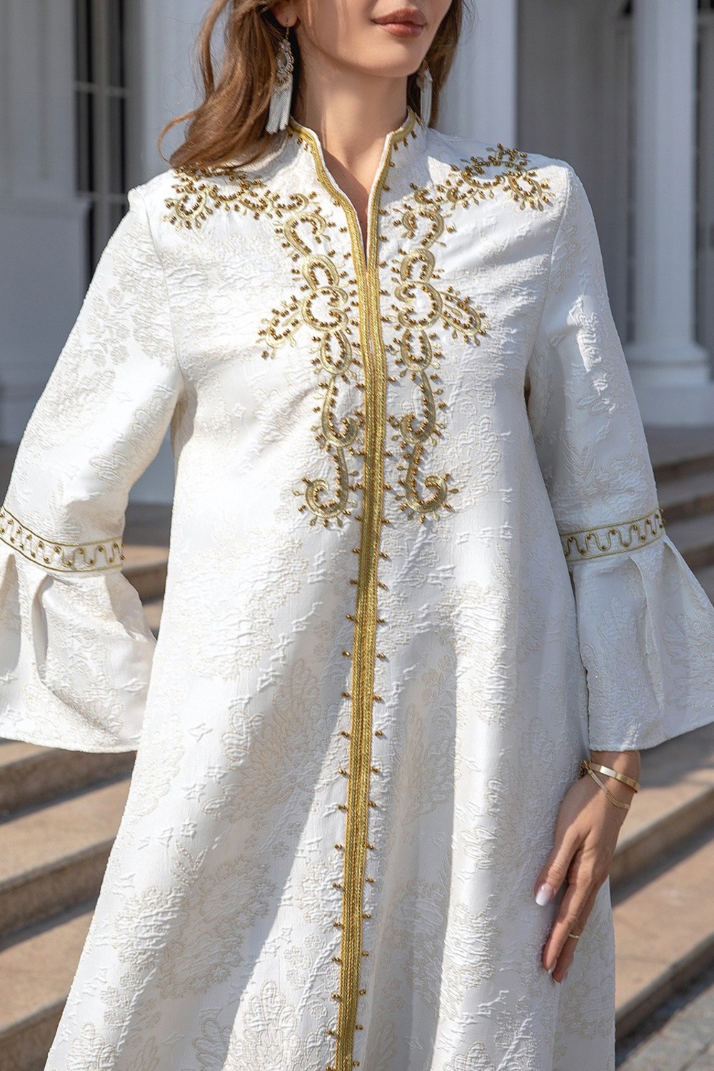 Caftan long, en jacquard texturé, broderies précieuses placées au buste, fermeture traditionnelle et manches volantées : une pièce élégante, idéale mariage civil & réception.