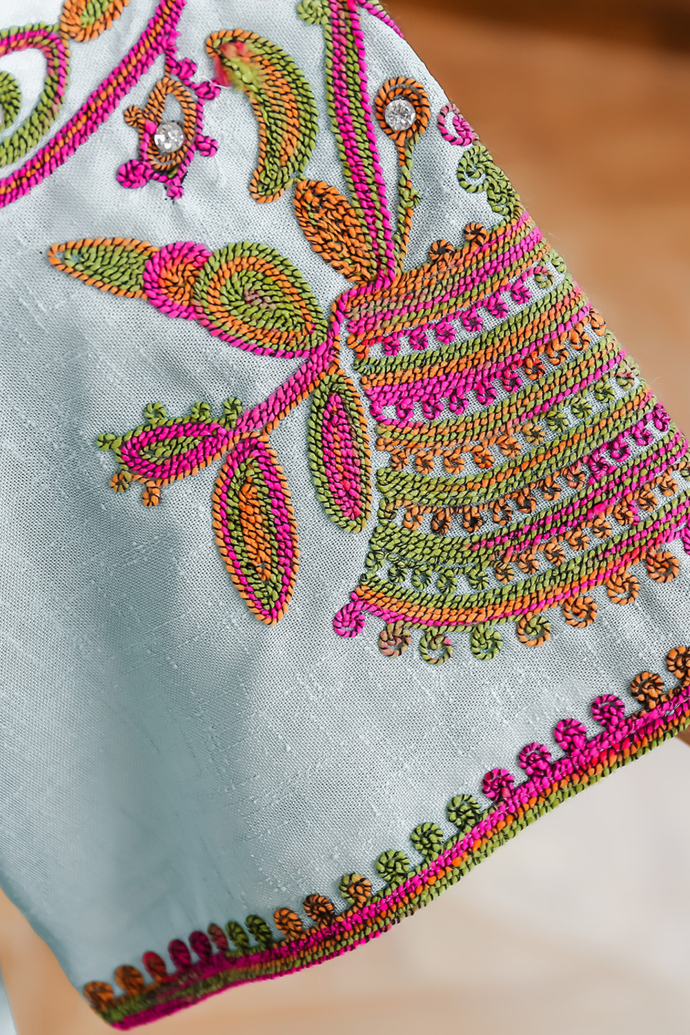 Bleu glacier lumineux - Broderies multicolores signature - Manches larges élégantes - Tombé fluide premium