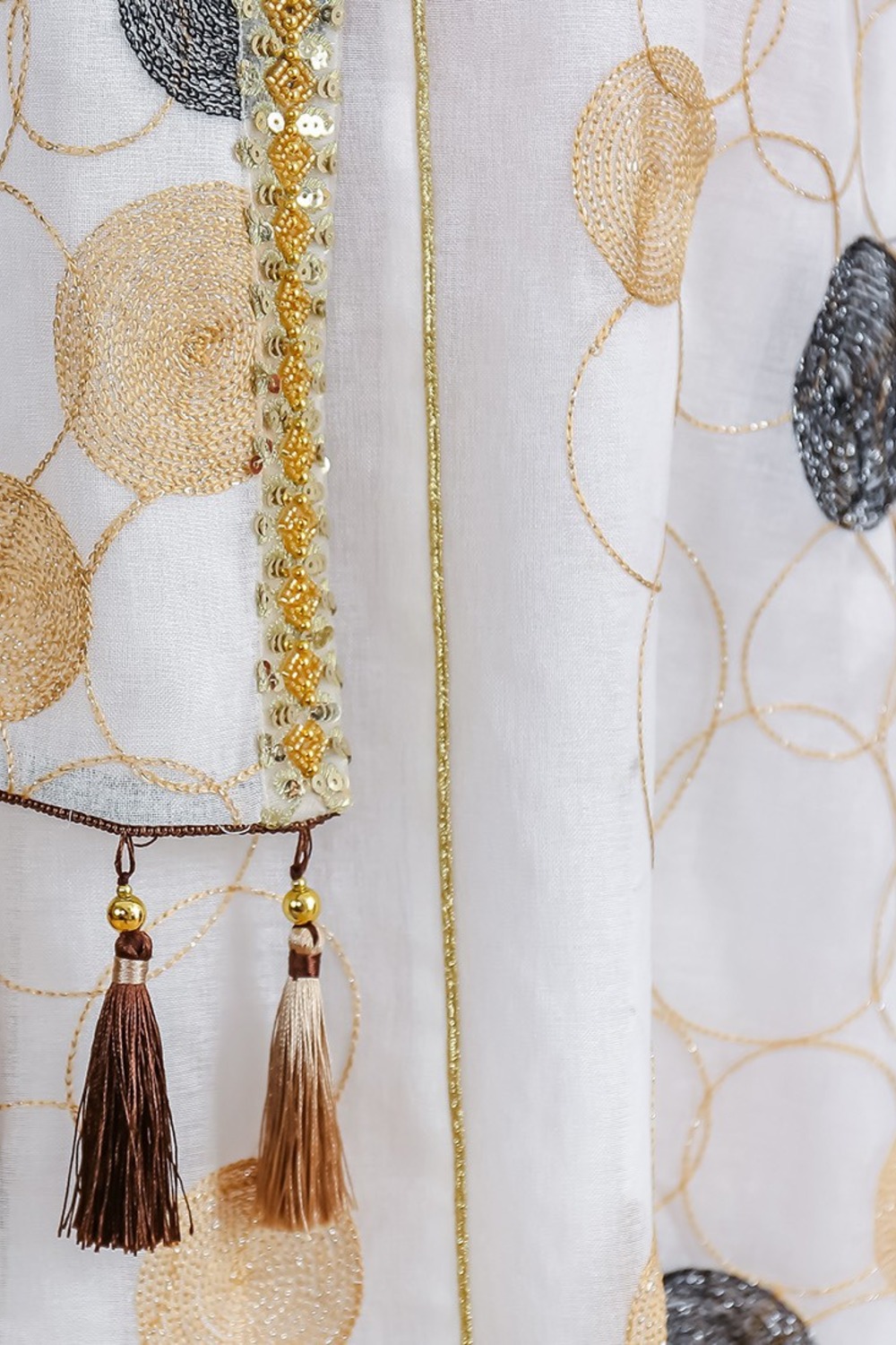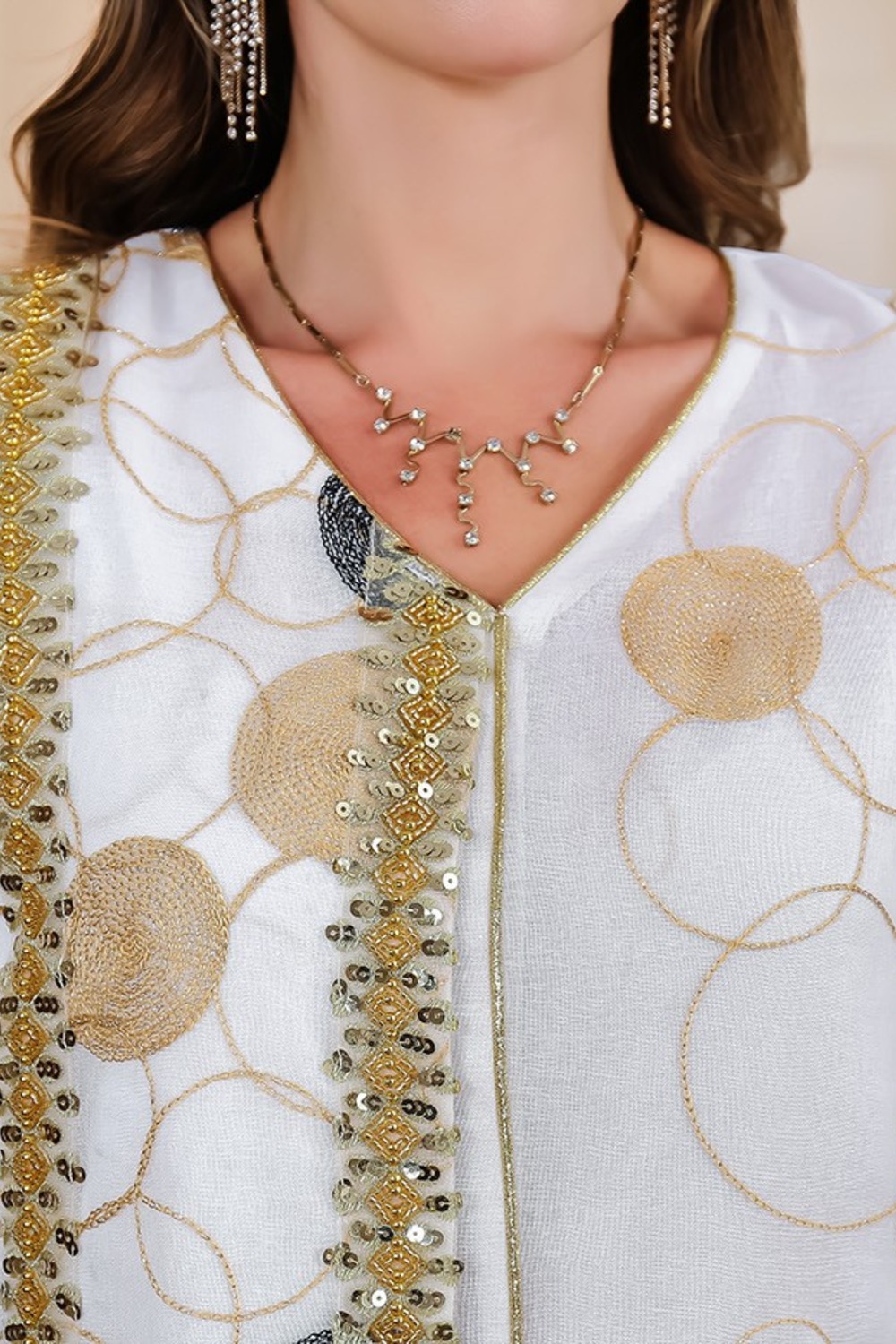 Longue blanche à motifs pois graphiques et col décoré : une élégance fraîche, idéale jour chic & réception.
