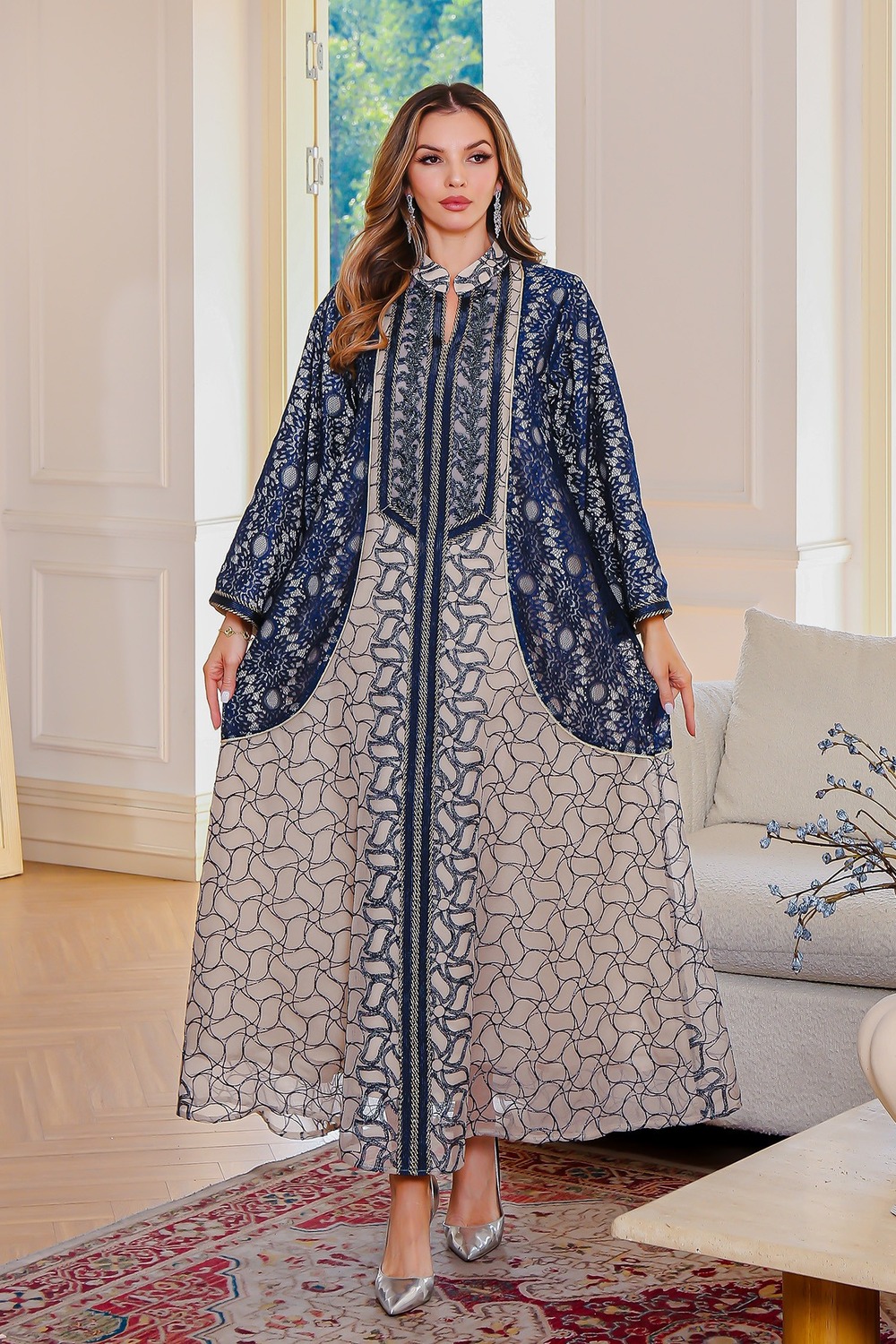 “Nuit & Sable” propose une silhouette longue, moderne et pratique grâce à ses contrastes et ses poches visibles. Le haut marine apporte structure, tandis que la partie beige imprimée donne de la lumière et du relief. La coupe ample garantit aisance et élégance, idéale pour un quotidien soigné.