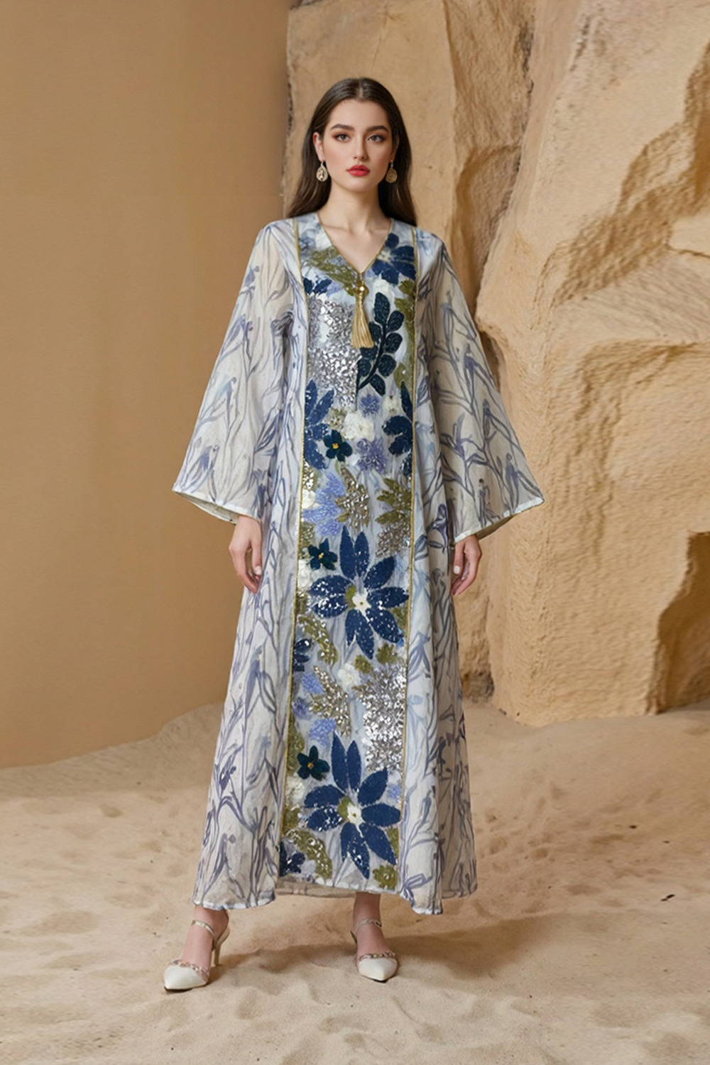 Plastron floral couture - Manches cape aériennes - Superposition légère raffinée - Silhouette longue prestigieuse