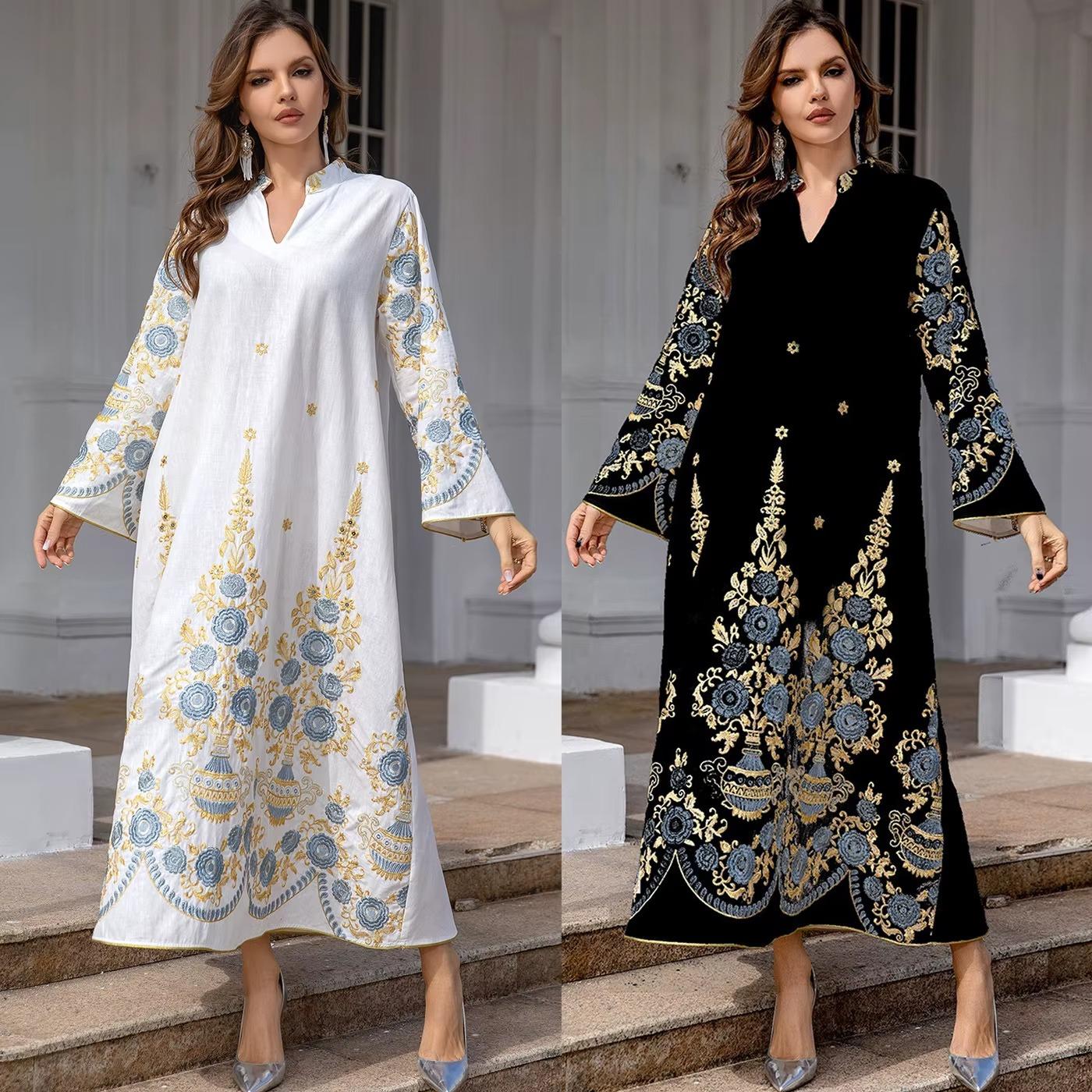 Robe longue à la coupe ample et fluide, sublimée par un motif ornemental raffiné qui lui confère une allure majestueuse et résolument féminine. Création raffinée aux accents orientaux, conçue pour sublimer la silhouette avec finesse. Sa ligne élégante accompagne les mouvements avec grâce et légèreté. Une robe raffinée qui met votre féminité en lumière.