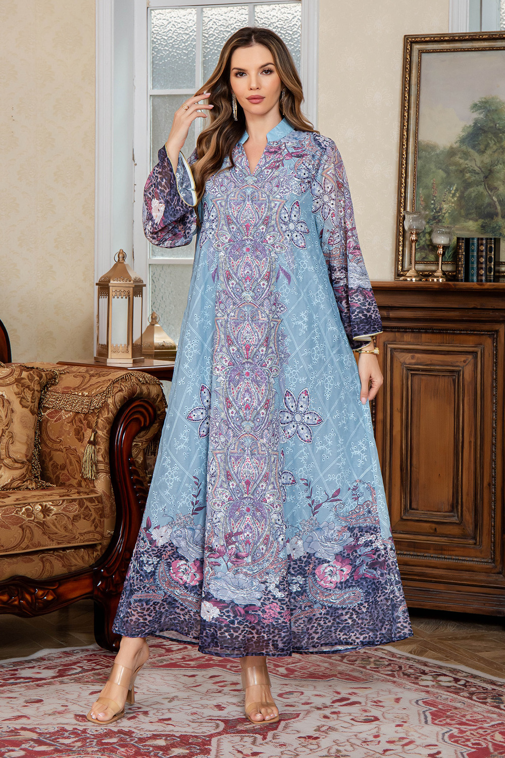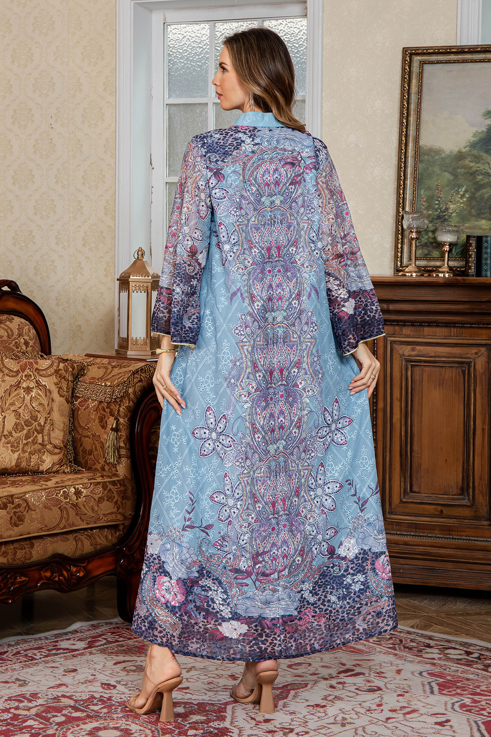Robe longue à médaillon central travaillé, motifs floraux et bordure signature, manches amples : une pièce spectaculaire, chic et confortable pour réceptions.